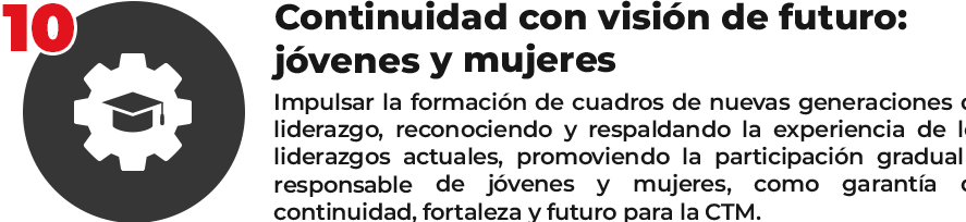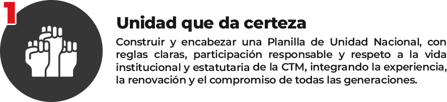 Mi compromiso es contigo, y con una CTM unida, innovadora, democrática y progresista; con los valores institucionales que la caracterizan y respetando siempre a quienes han trazo el rumbo del movimiento obrero organizado, al tiempo que nos encaminamos a los desafíos futuros con convicción y preparación.